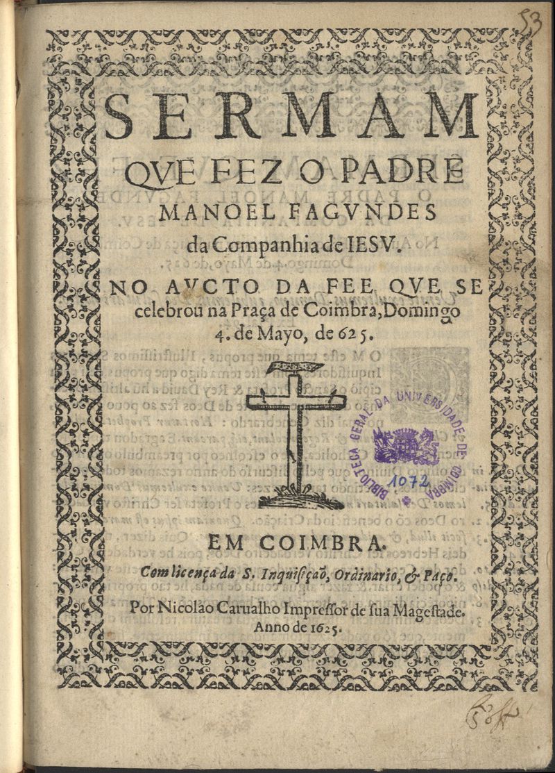 Rosto com larga cercadura, impr. com pequenas vinhetas, dispostas simetricamente e, no meio, cruz alçada; última p. com vinheta ornamental, tendo, no centro, escudo de armas.