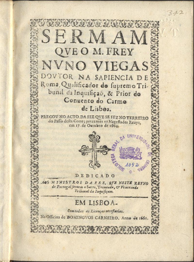 Sermam que o M. Frey Nuno Viegas ... pregou no acto da fee que se fez no Terreiro do Passo desta Corte ... a 17 de Outubro de 1660