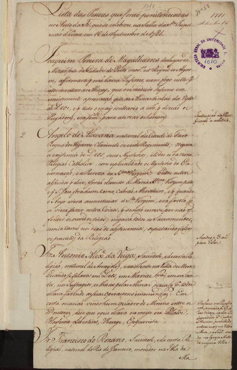 O copista deste manuscrito parece ter sido o mesmo que fez a ±Lista dos Penitenciados pelo Stº Officio... no Acto publico da Fé... em Coimbra na Salla do mesmo Tribunal em 26. de Agosto de 1781»