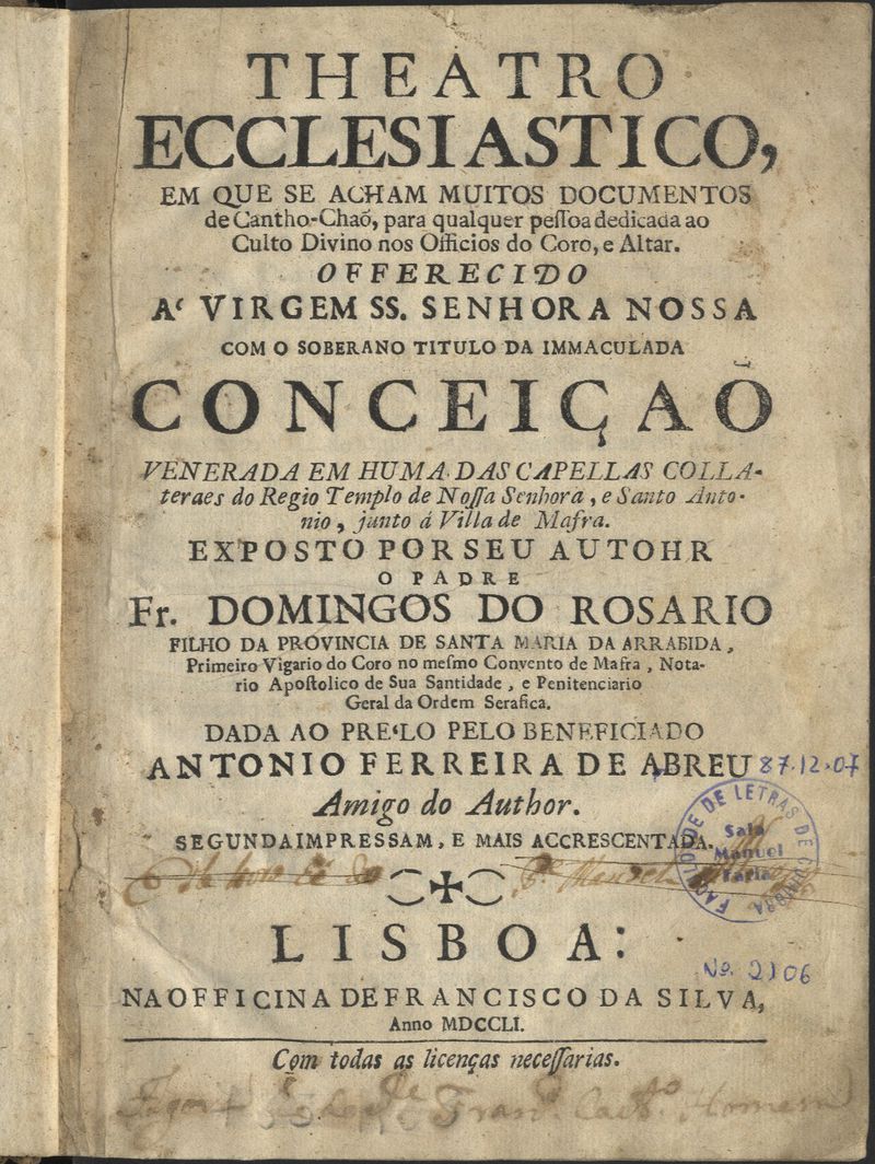 Theatro ecclesiastico, em que se acham muitos documentos de Canto-Chao, para qualquer pessoa dedicada ao Culto Divino nos Officios do Coro e Altar