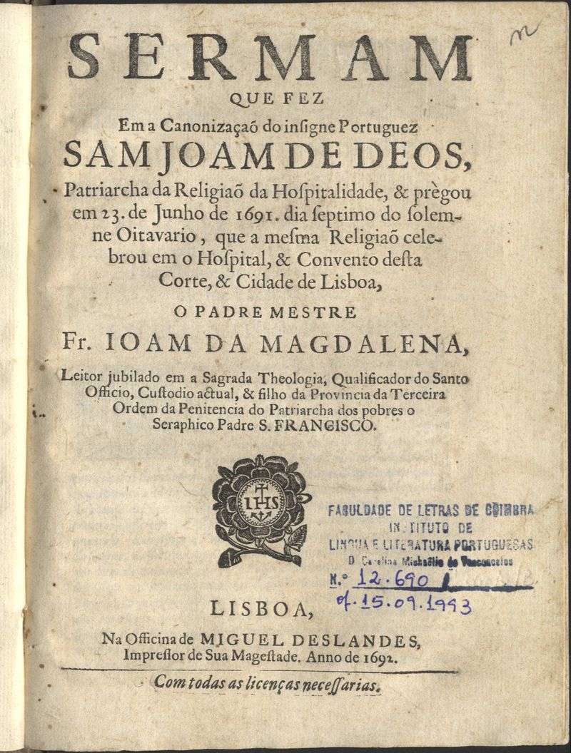 Lisboa : Na officina de Miguel Deslandes, 1692