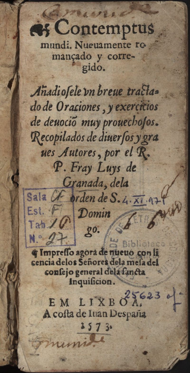 Contemptus mundi. Nueuamente romançado y corregido. Añnadiosele [sic] vn breue tractado de Oraciones y exercicios de deuociõ muy prouechosos