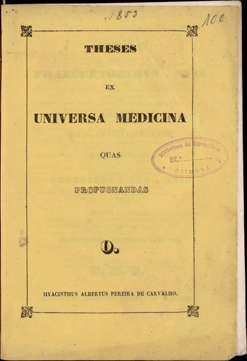 Theses ex universa medicina decerptae, quas, praeside clarissimo et sapientissimo D. D. Joannes Lopes de Moraes...in gymnasio Academiae Conimbricensis...propugnandas offert Hyacinthus Albertus Pereira de Carvalho