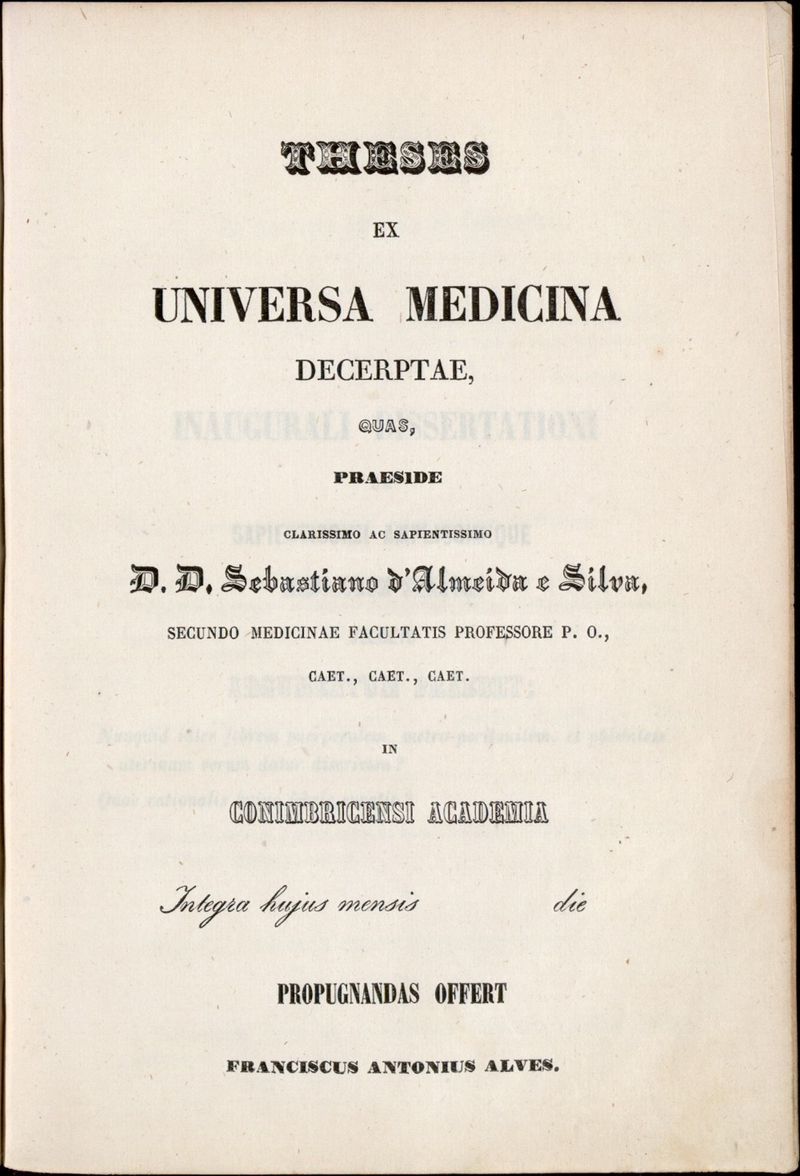Theses ex universa medicina decerptae, quas, praeside clarissimo ac sapientissimo D. D. Sebastiano d`Almeida e Silva...in Conimbricensi Academia...propugnandas offert Franciscus Antonius Alves