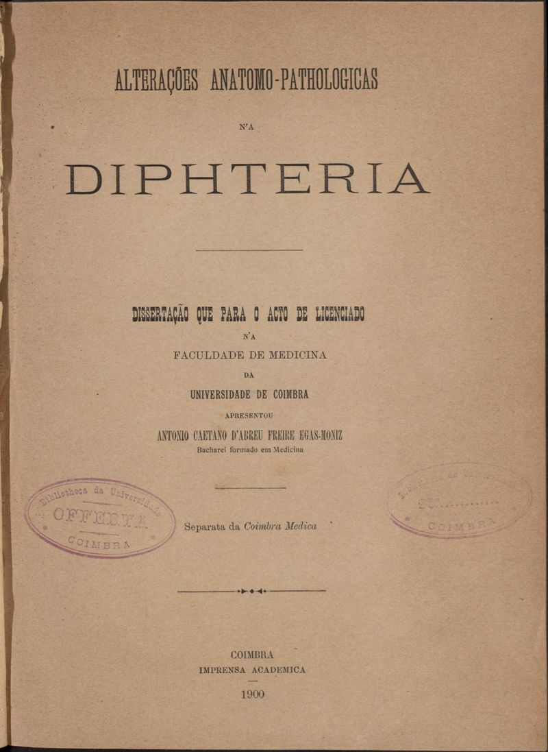 Alterações anatomo-pathologicas n'a diphteria : dissertação que para o acto de licenciado n'a Faculdade de Medicina da Universidade de Coimbra apresentou Antonio Caetano d'Abreu Freire Egas-Moniz