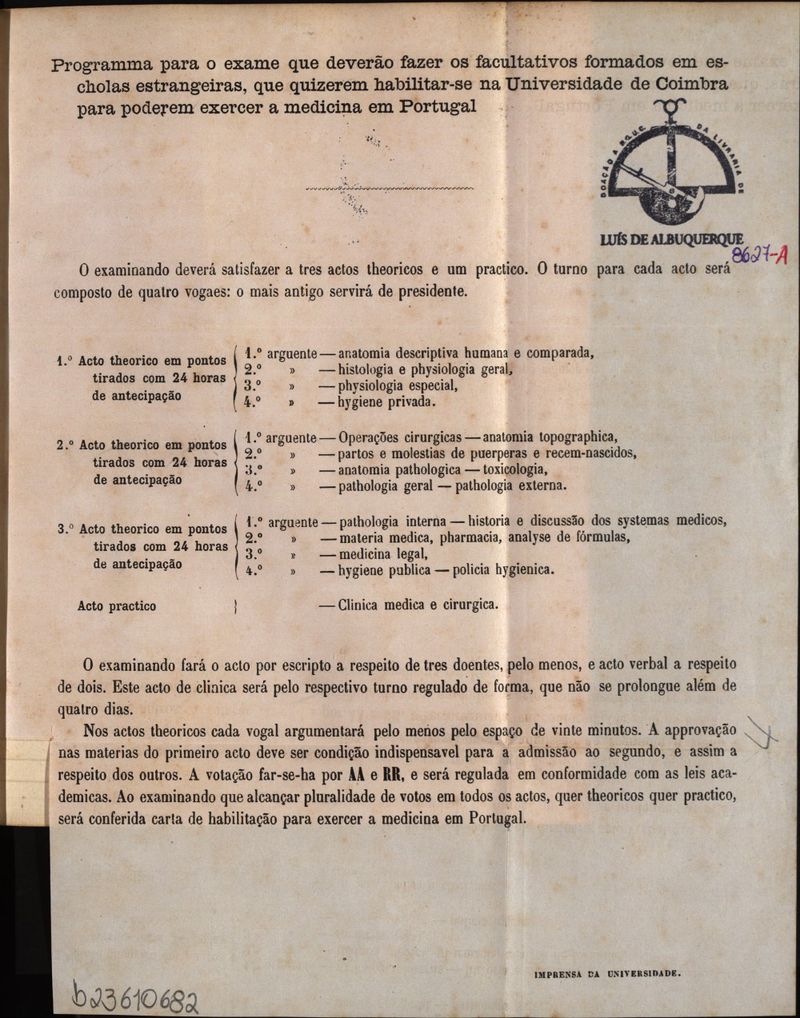 Programa para o exame que deverão fazer os facultativos formados em escolas estrangeiras, que quiserem habilitar-se na Universidade de Coimbra para poderem exercer a medicina em Portugal