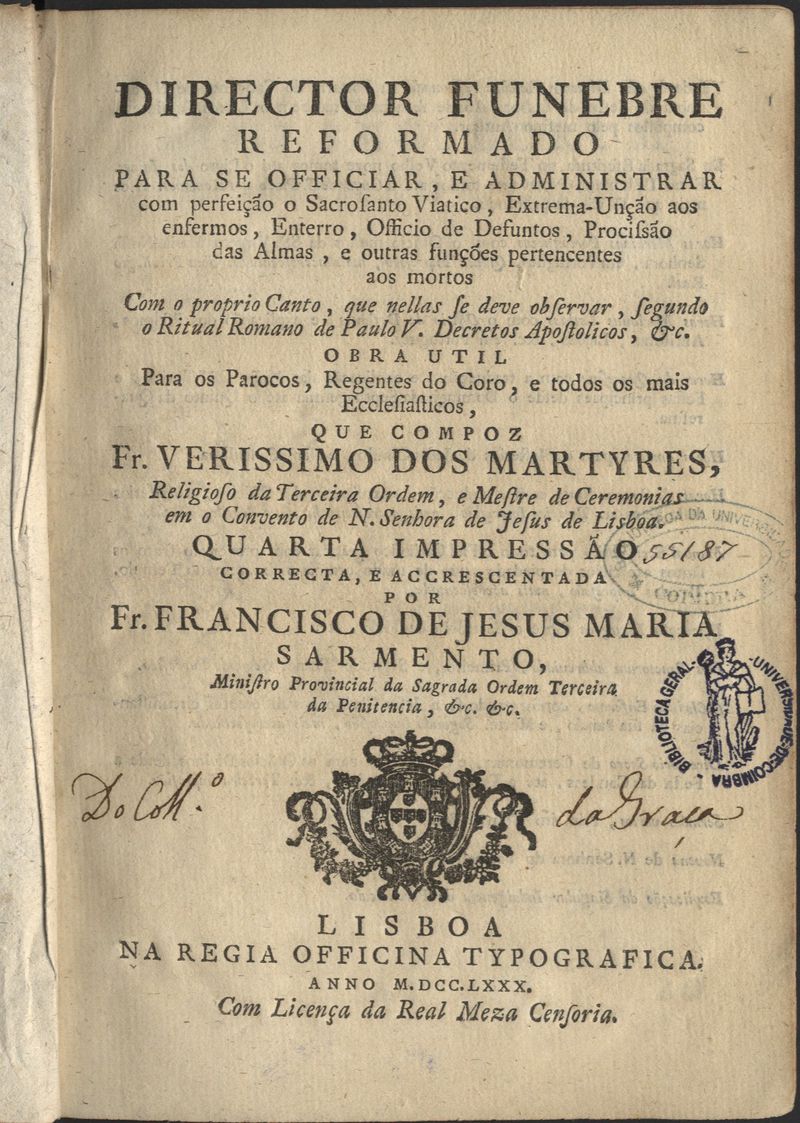 Director fúnebre reformado para se oficiar, e administrar com perfeição o sacrosanto viático, extrema-unção aos enfermos, enterro, ofício dos defuntos, procissão das almas, e outras funções pertencentes aos mortos com o próprio canto, que nelas se deve observar, segundo o Ritual Romano de Paulo V Decretos Apostólicos, etc ...