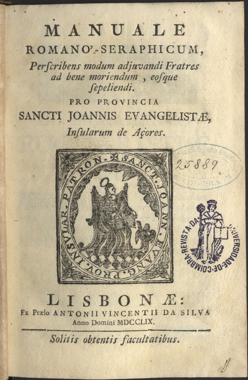 Manuale romano-seraphicum, perscribens modum adjuvandi Fratres ad bene moriendum, eosque sepeliendi. Pro provincia Sancti Joannis Evangelistae, insularum de Açores
