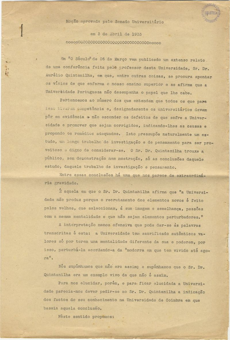 Com o título "Moção aprovada pelo Senado Universitário em 3 de Abril de 1933".