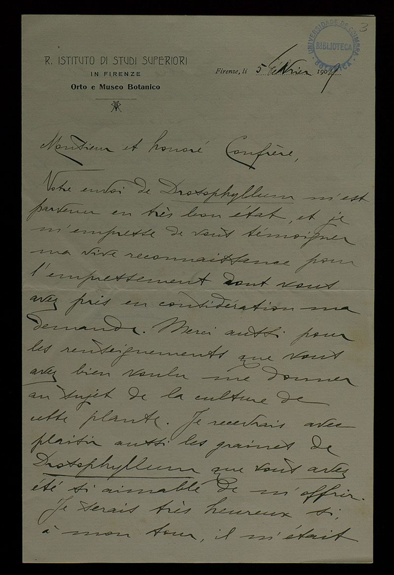 Papel timbrado de: R. Istituto di Studi Superiori in Firenze - Orto e Museo BotC"nico.