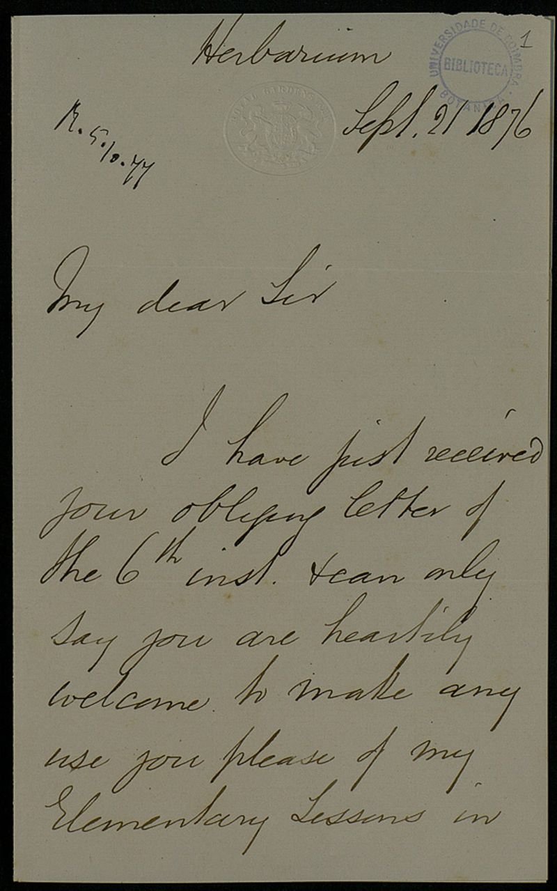 [Letter], 1876 Sept. 21, Kew, [to Júlio Henriques, Coimbra]