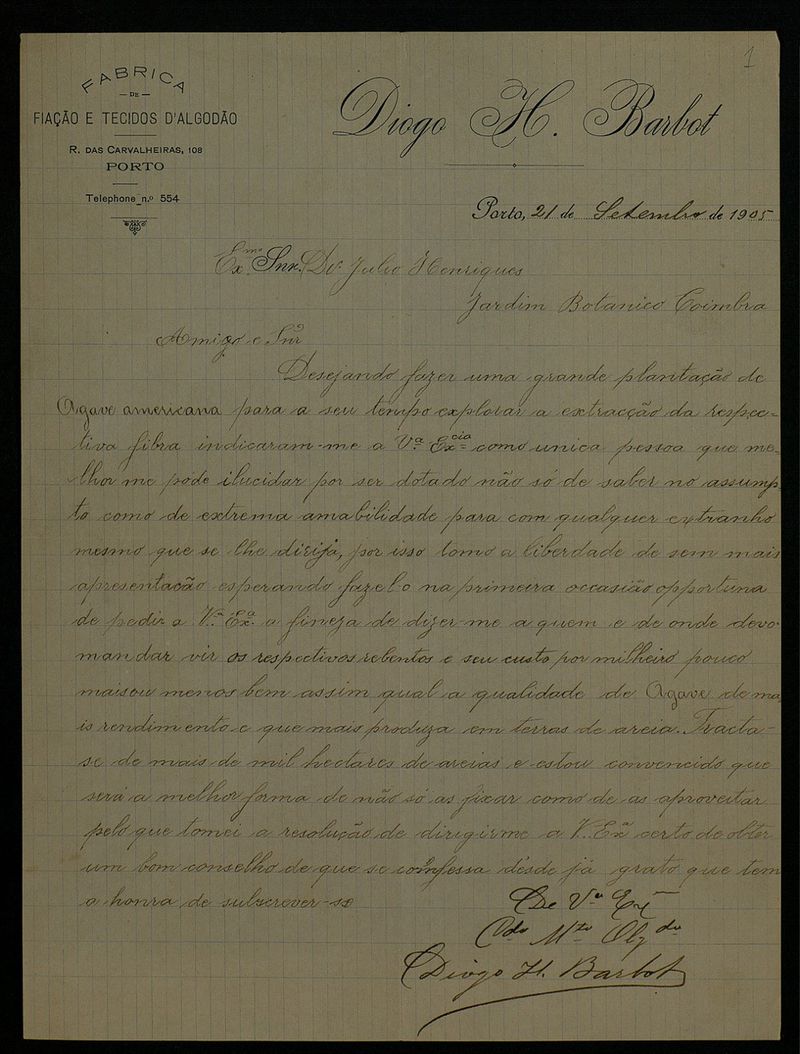 [Carta], 1905 Set. 21, Porto, [a] Dr. Júlio Henriques, Coimbra