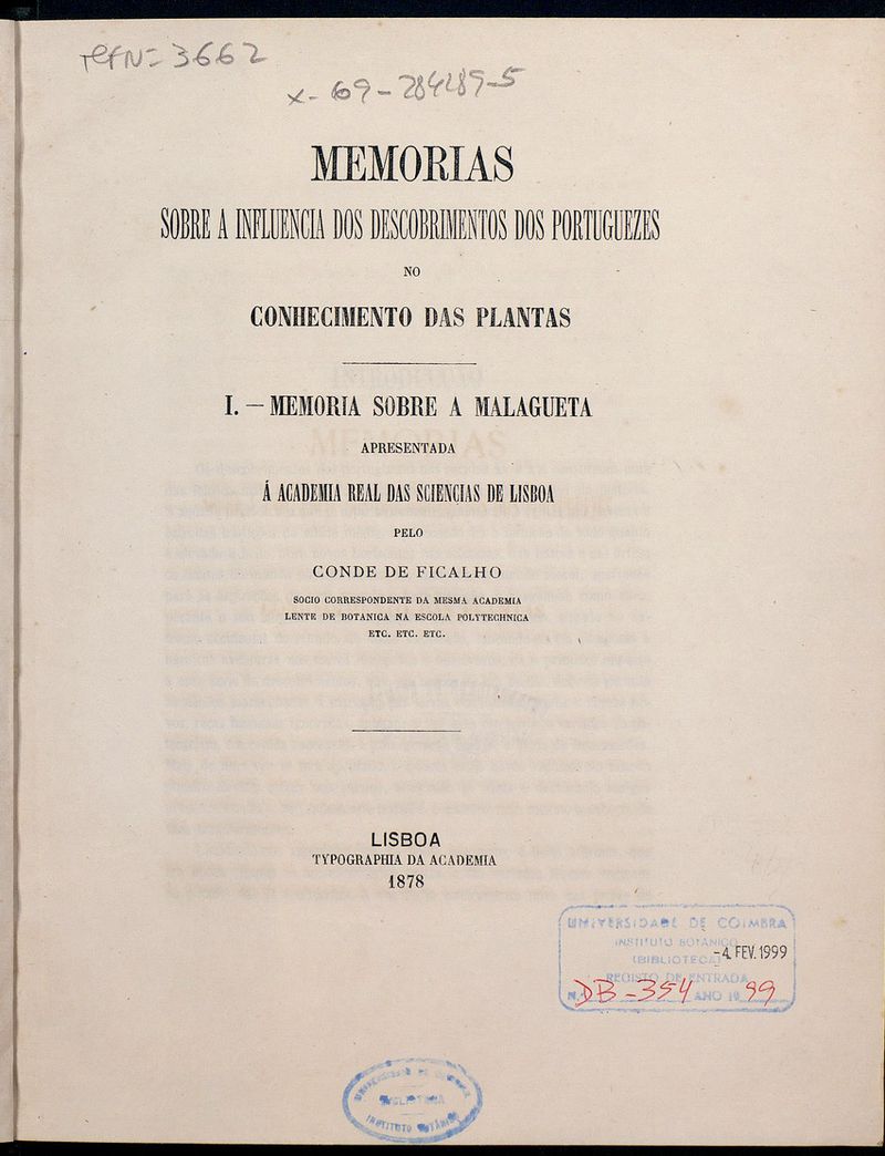 Memorias sobre a influencia dos descobrimentos dos portuguezes no conhecimento das plantas. I. memoria sobre a malagueta apresentada à Academia Real das Sciencias de Lisboa pelo Conde de Ficalho