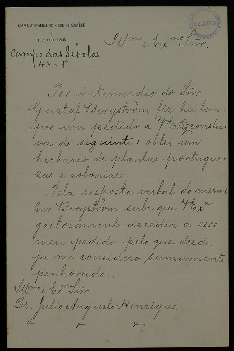 [Carta], 1901 Jun. 11, Lisboa, [a] Dr. Julio Augusto Henriques, Coimbra