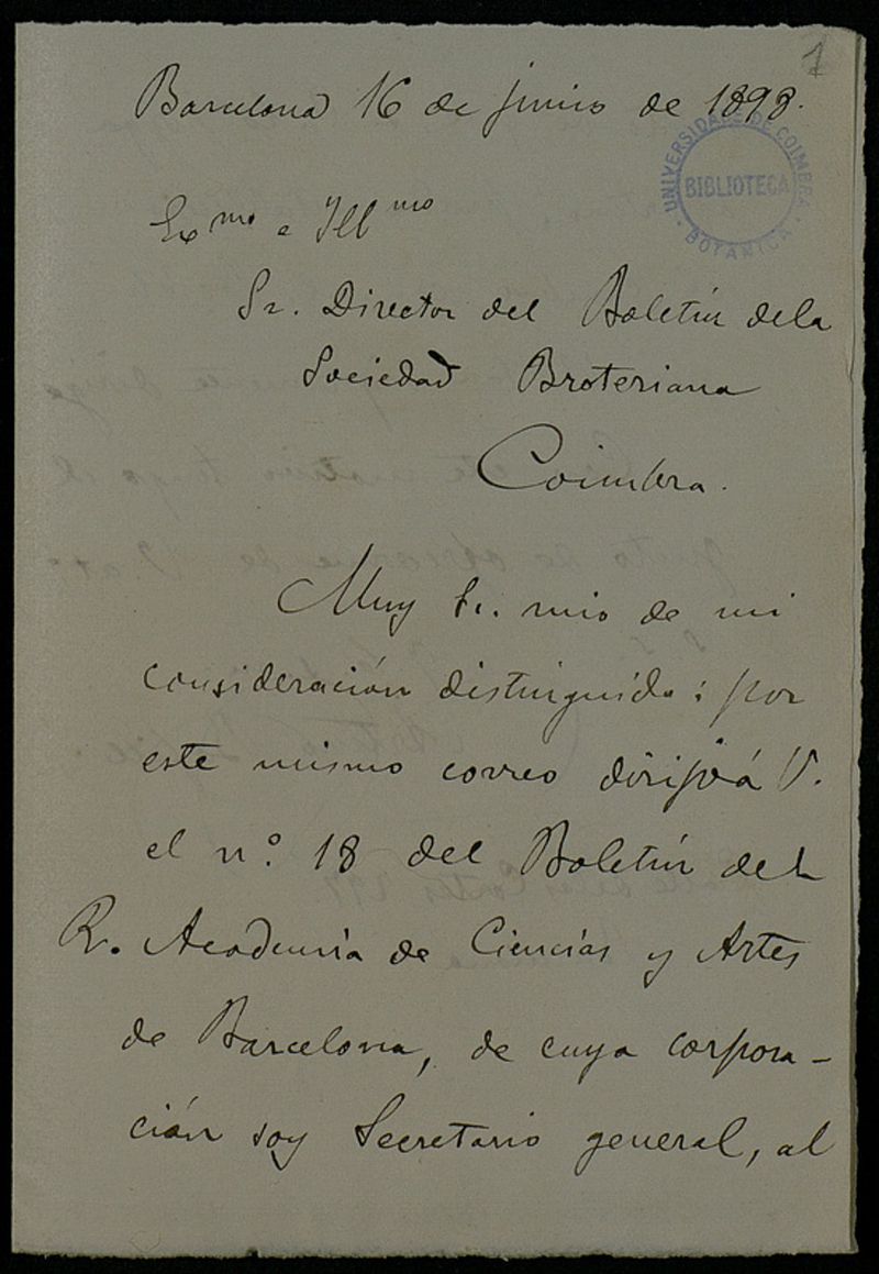 [Tarjeta postal], 1898 jun. 16, Barcelona, [a Júlio Henriques], Coimbra