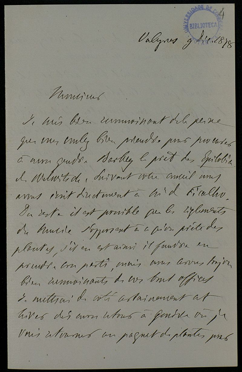 [Lettre], 1878 déc. 9, Valeyres, [à] Monsieur [Júlio Henriques, Coimbra]
