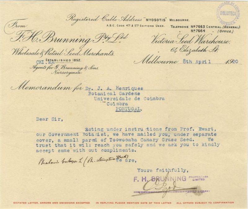 Em papel timbrado de "F.H. Brunning Pty. Ltd - Wholesale & Retail Seed Merchants".