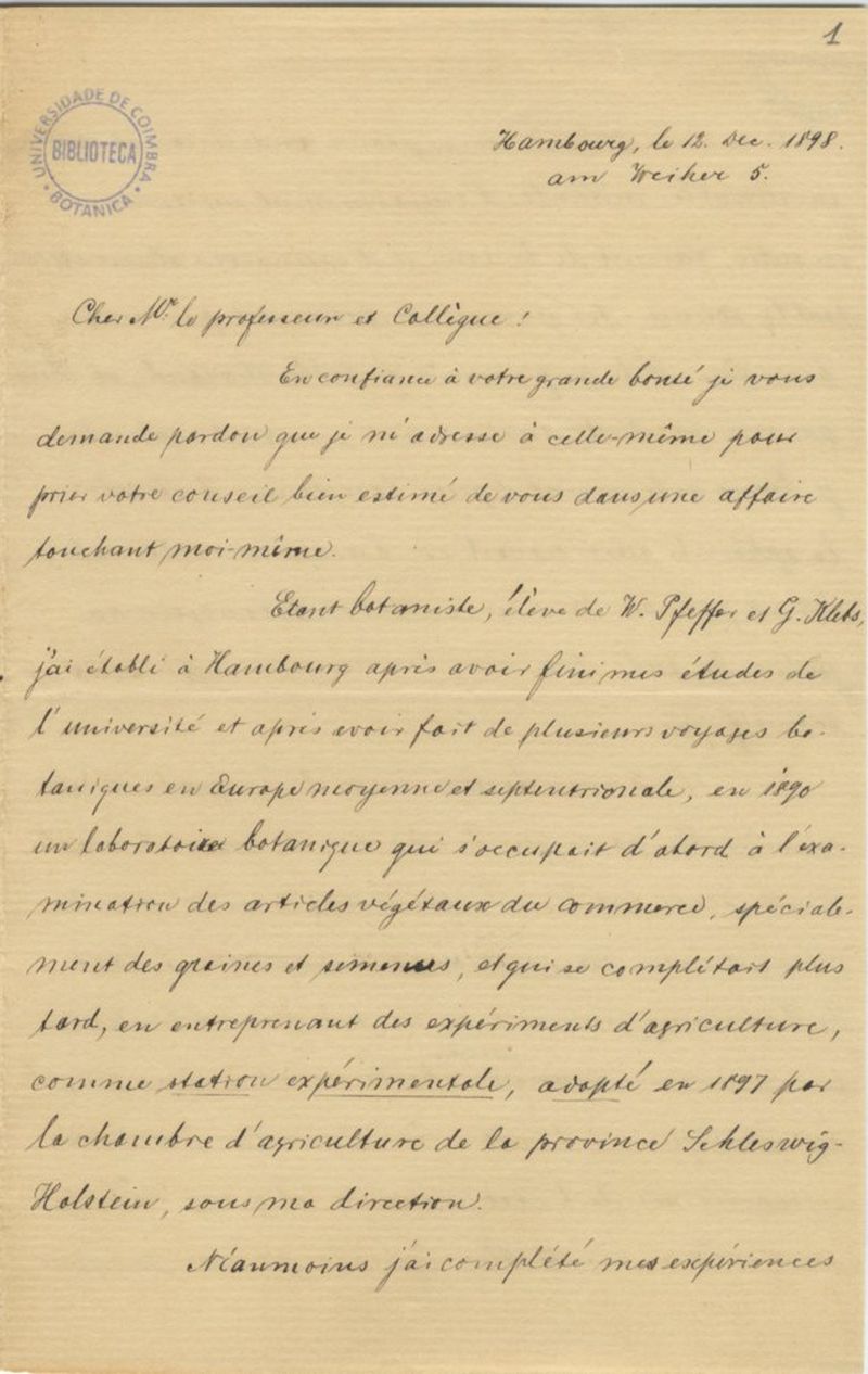 [Lettre], 1898 déc.12, Hambourg, [à Júlio Henriques, Coimbra]