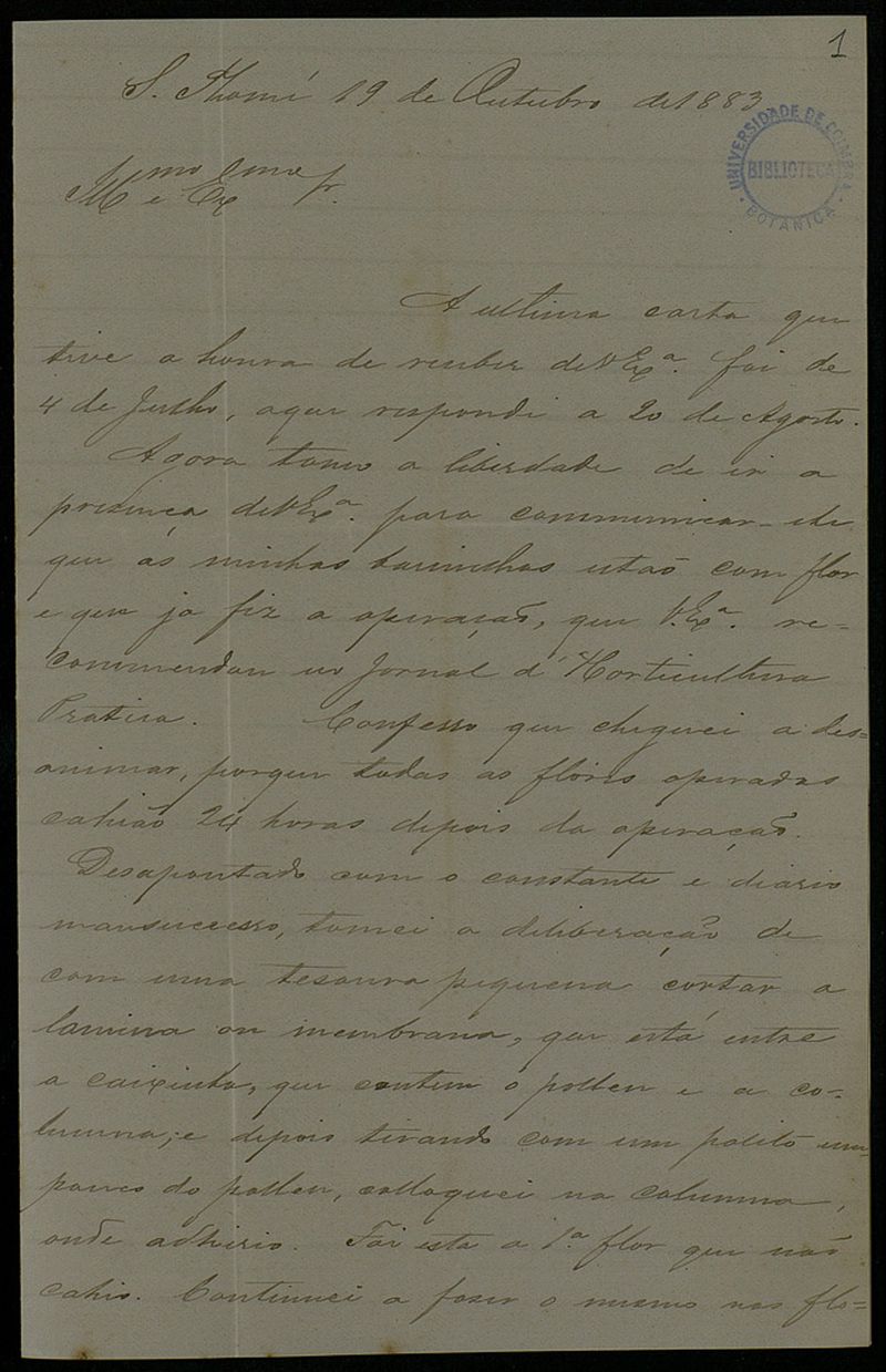 [Carta], 1883 Out. 19, S. Thomé, [a Júlio Henriques], Coimbra