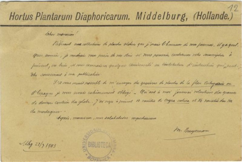 Cartão timbrado de "Hortus Plantarum Diaphoricarum - Middelburg (Hollande)".