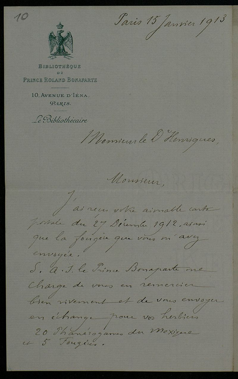 [Lettre], 1913 jan. 15, Paris, [à] Monsieur le Dr. [Júlio] Henriques, [Coimbra]