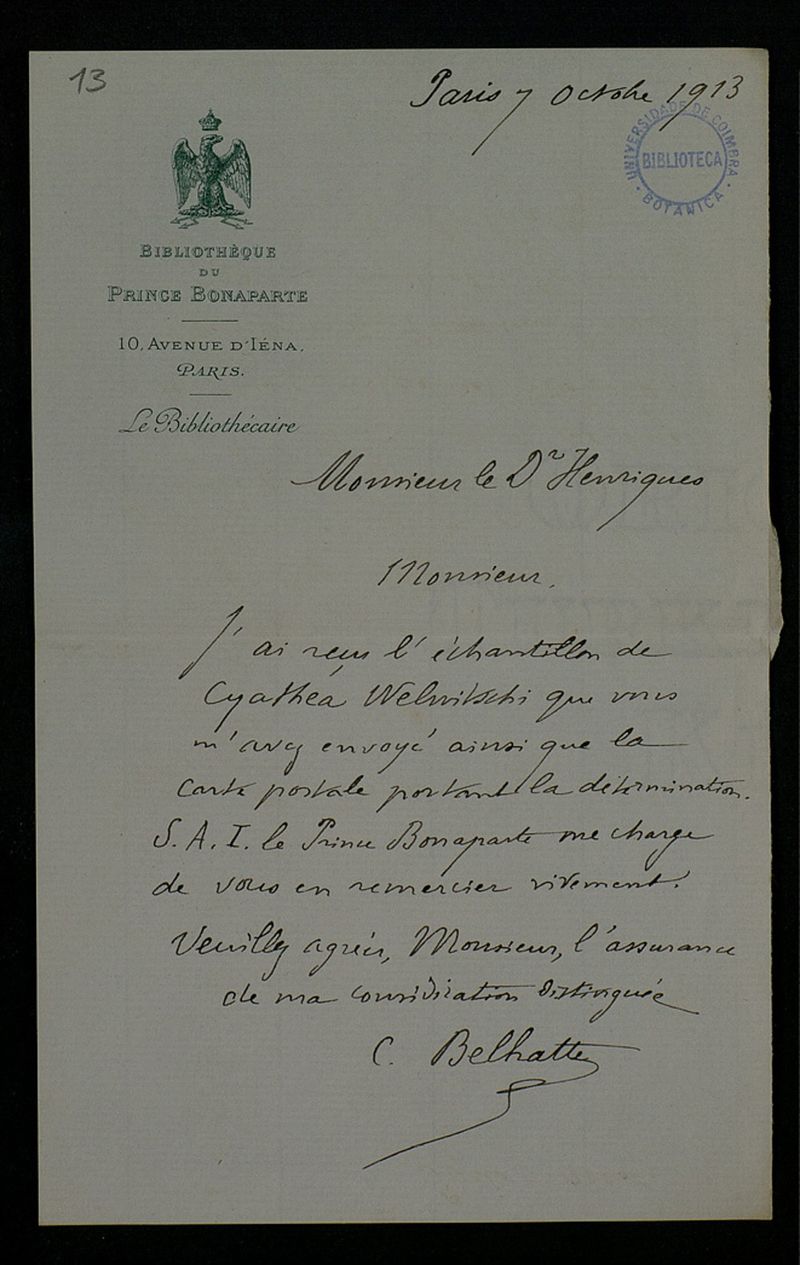 [Lettre], 1913 oct. 7, Paris, [à] Monsieur le Dr. [Júlio] Henriques, [Coimbra]