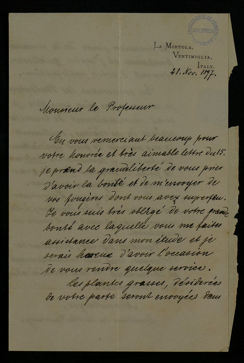[Lettre], 1897 nov. 21, La Mortola, [à] Monsieur le Professeur Dr. J. A. Henriques, Coimbra
