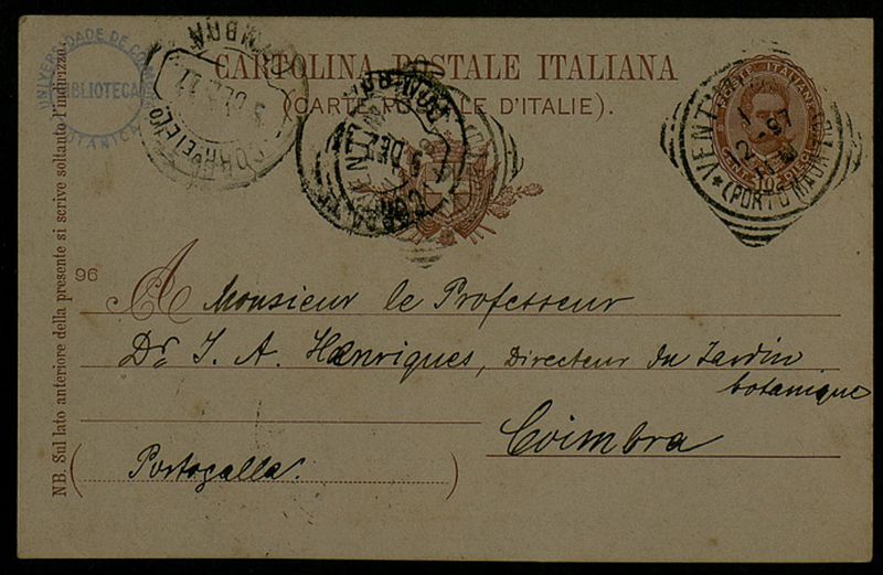 Cartolina Postale Italiana, 1897 nov. 30, La Mortola, [à] Monsieur le Professeur Dr. J. A. Henriques, Coimbra