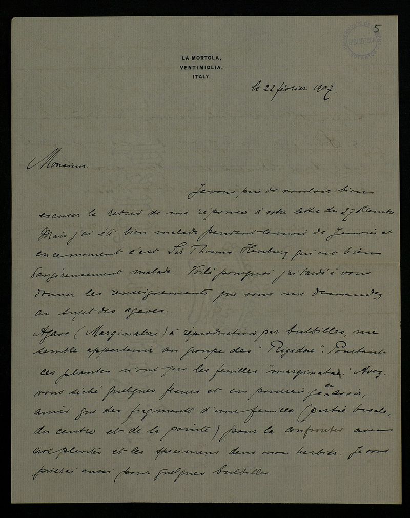 [Lettre], 1907 fév. 22, La Mortola, [à] Monsieur [Júlio Henriques], Coimbra