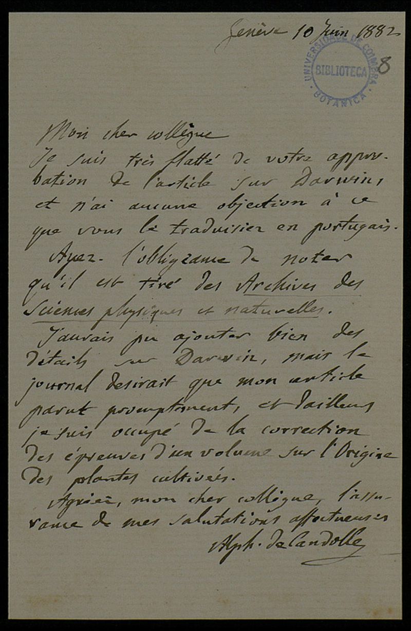 [Lettre], 1882 juin 10, Genève, à Júlio Henriques, Coimbra