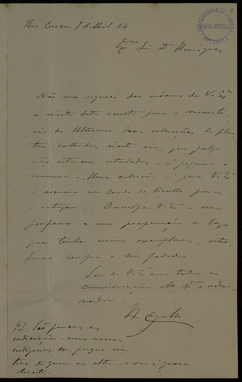 [Carta], 1884 Abr. 7, Rio Coroca, a Dr. [Júlio] Henriques, [Coimbra]