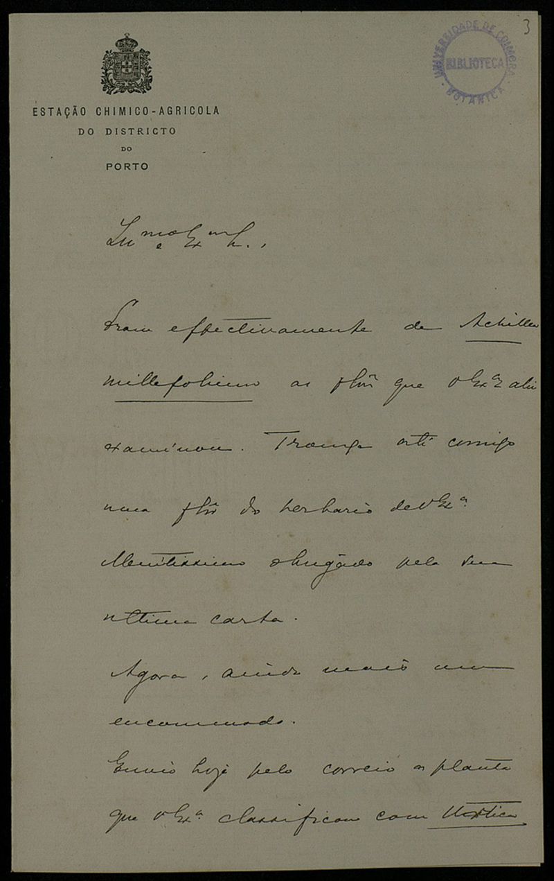 Papel timbrado de: Estação Chimico-Agricola do Districto do Porto.