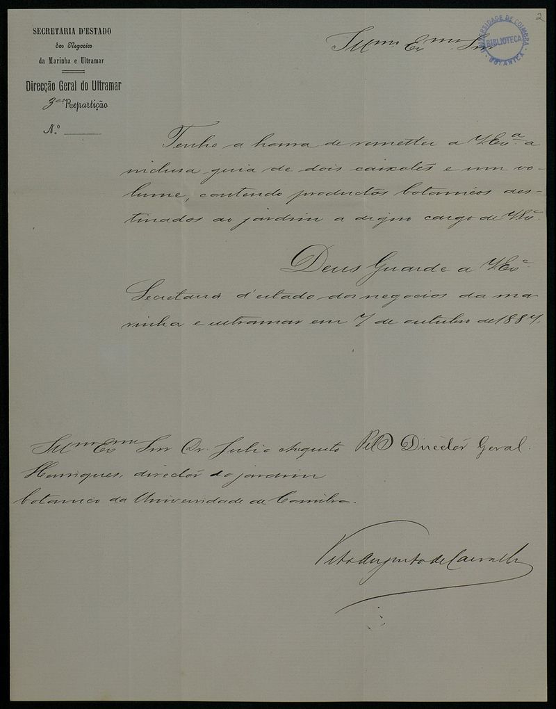 [Carta], 1887 Out. 7, [Lisboa], a Dr. Júlio Augusto Henriques, Coimbra