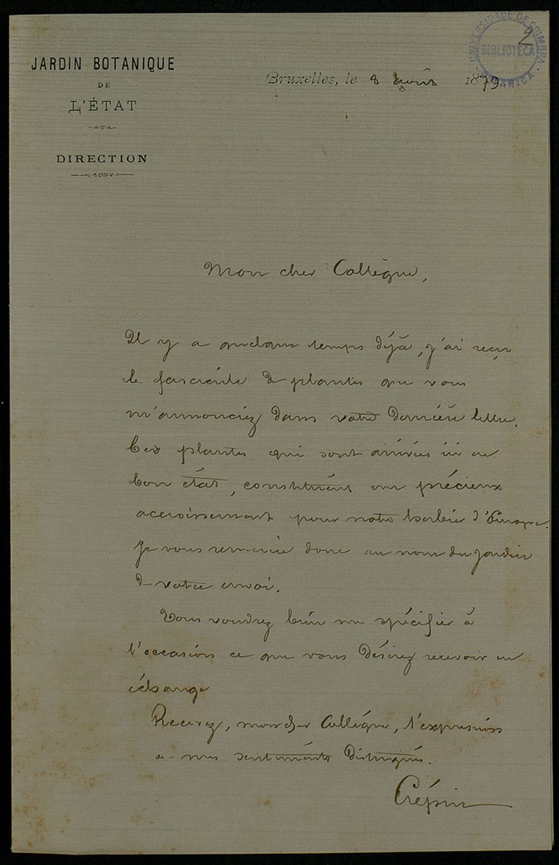 [Lettre], 1879 avr. 8, Bruxelles, [à Monsieur Júlio Henriques, Coimbra]