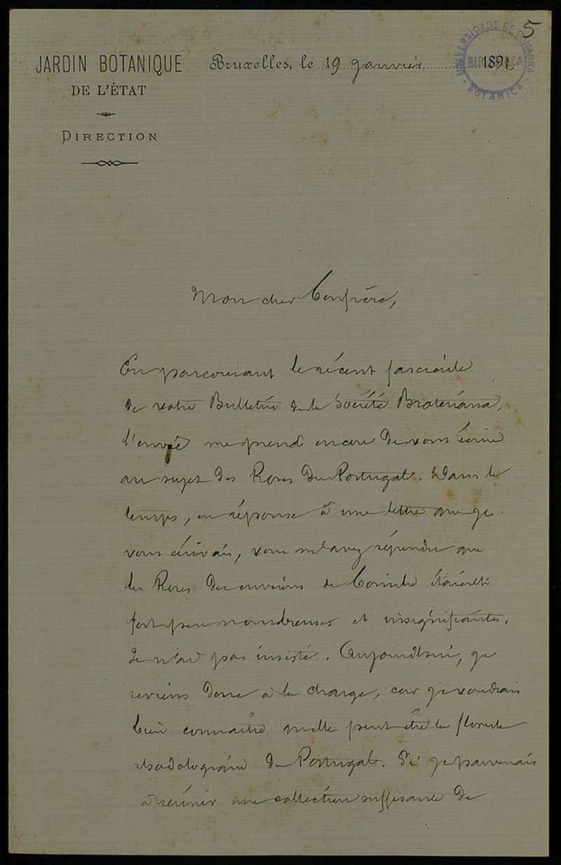 [Lettre], 1891 jan. 19, Bruxelles, [à Monsieur Júlio Henriques, Coimbra]