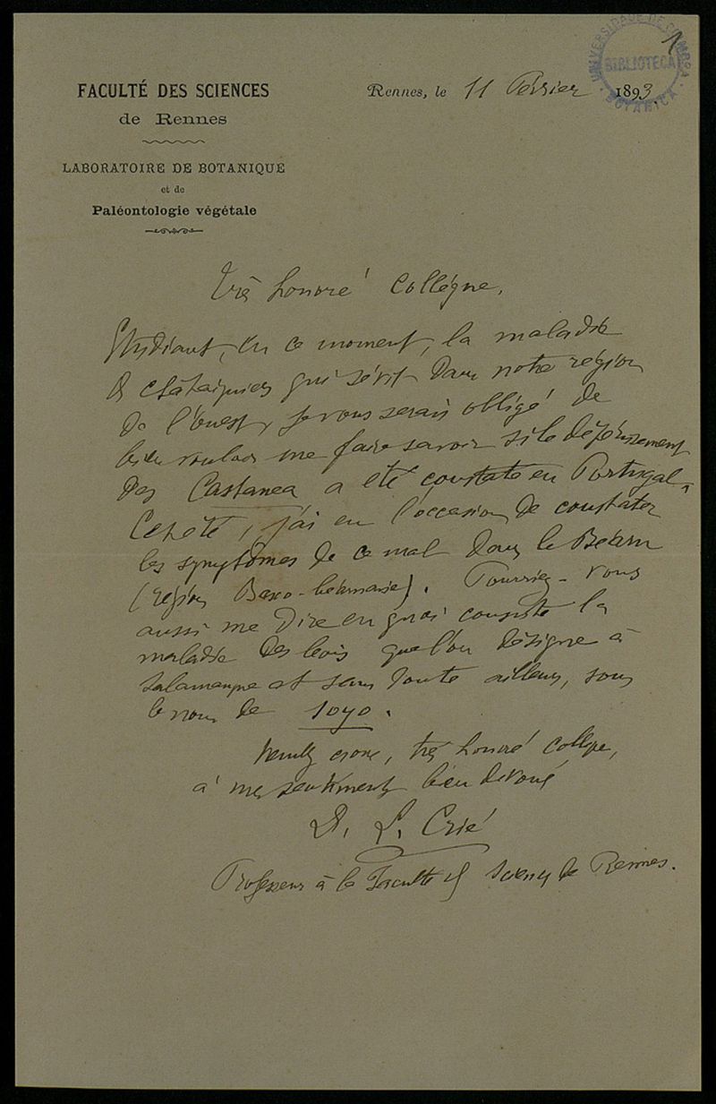 [Lettre], 1893 fév. 11, Rennes, [à Monsieur Júlio Henriques, Coimbra]
