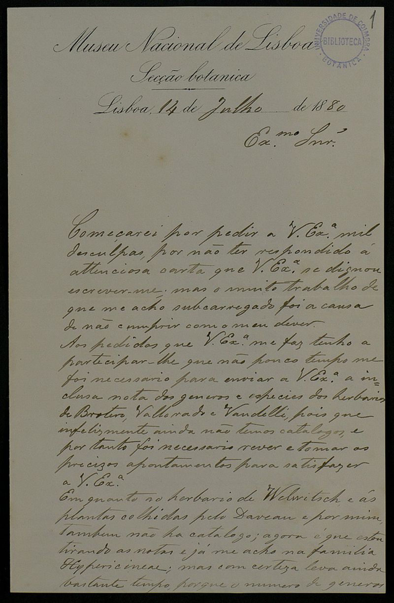 [Carta], 1880 Jul. 14, Lisboa, [a Júlio Henriques, Coimbra]