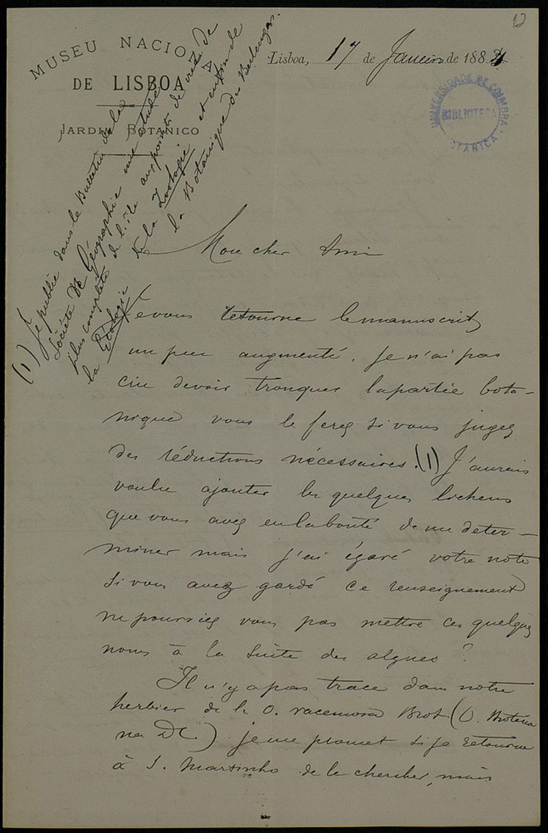 [Lettre], 1884 jan. 17, Lisboa, [à] Júlio Henriques, Coimbra