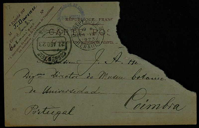 Carte postale, 1923 août, Montpellier, [à] Júlio Henriques, Coimbra
