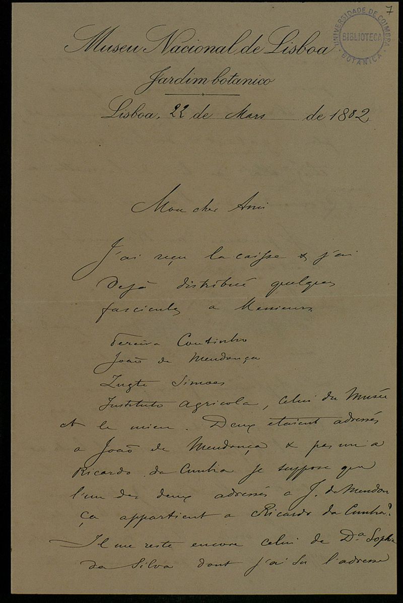 Papel timbrado de: Museu Nacional de Lisboa Jardim Botanico.