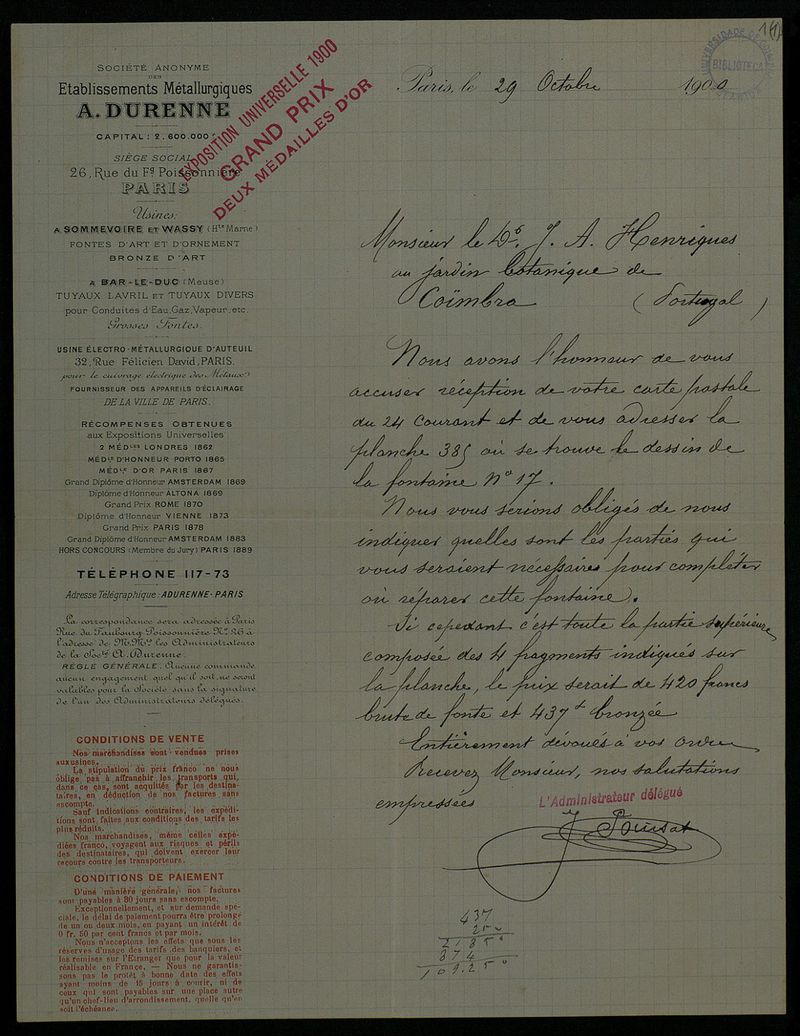 [Lettre], 1900 oct. 29, Paris, [à] Monsieur le Dr. J. A. Henriques, Coimbra