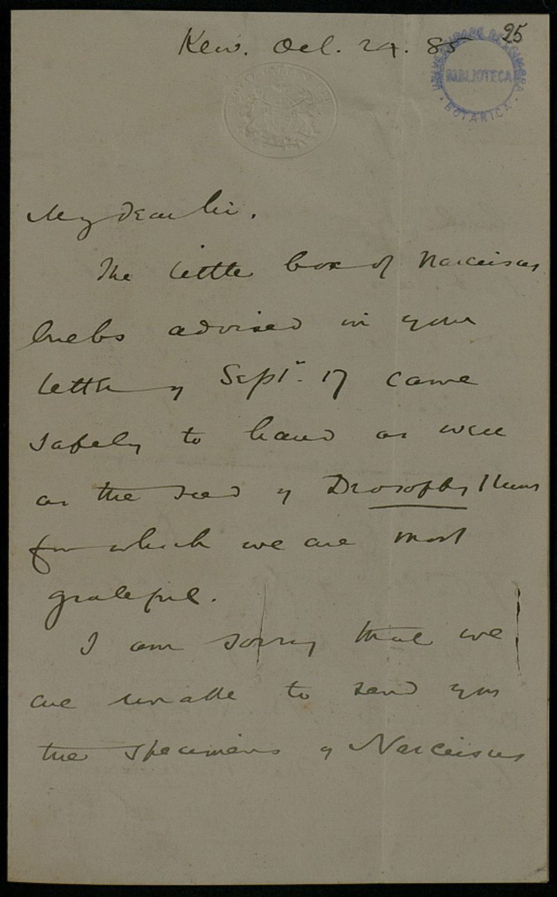 [Letter], 1885 Oct. 24, Kew, [to Júlio Henriques, Coimbra]