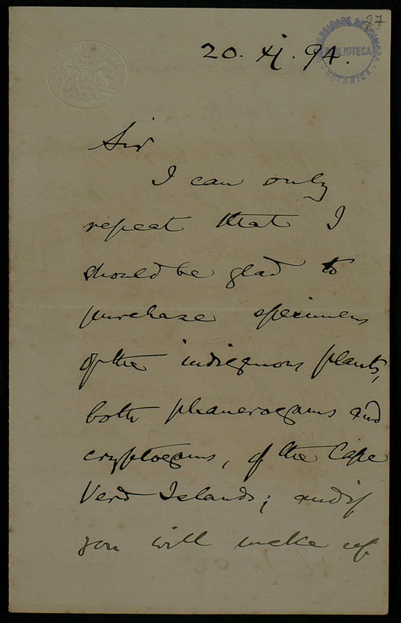 [Letter], 1894 Nov. 20, London, [to Júlio Henriques, Coimbra]