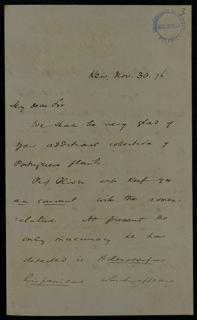 [Letter], 1876 Nov. 30, Kew, [to] Sir [Júlio Henriques, Coimbra]