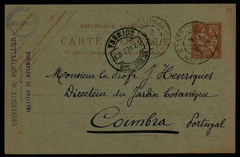 Carte postale, 1903 déc. 13, Montpellier, [à] Monsieur le Profr J. Henriques, Coimbra