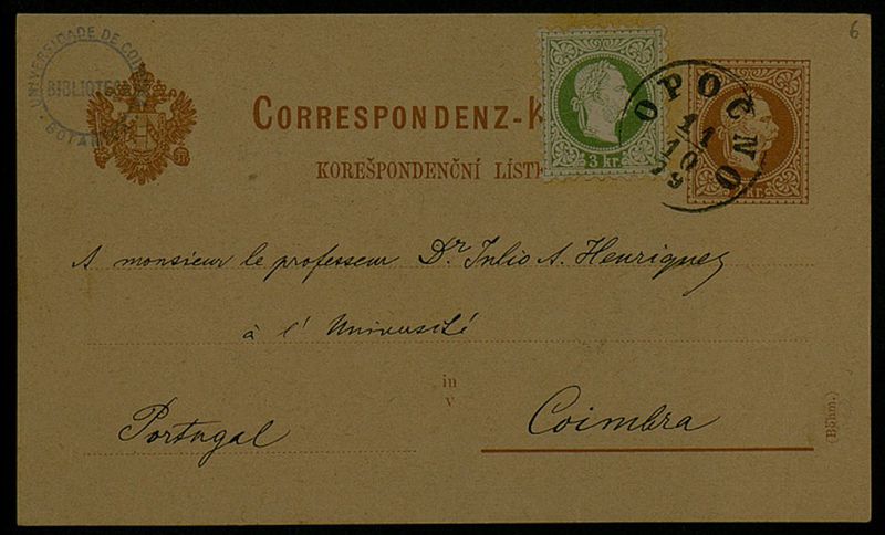 Correspondenz-Karte, 1879 oct. 10, Opočno, à Dr. Júlio A. Henriques, Coimbra