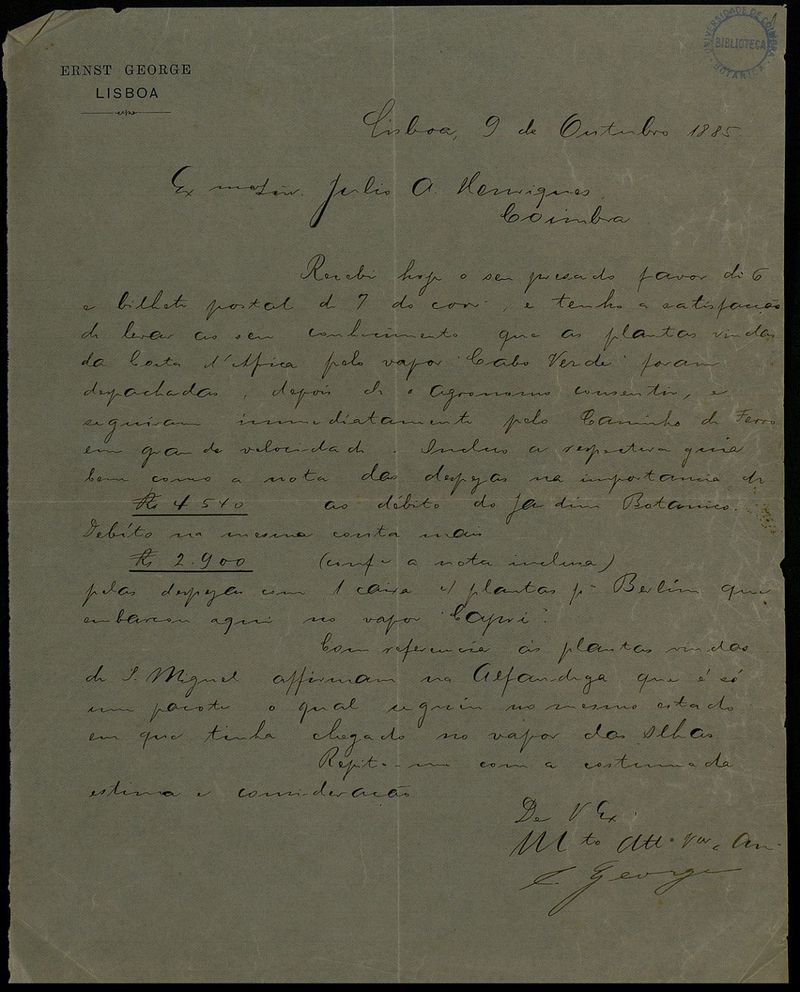 [Carta], 1885 Out. 9, Lisboa, [a] Julio A. Henriques, Coimbra