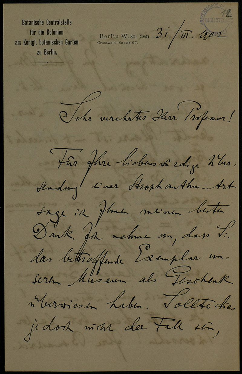 Papel timbrado de: Botanische Centralstelle für die Kolonien am Königl. botanischen Garten zu Berlin.
