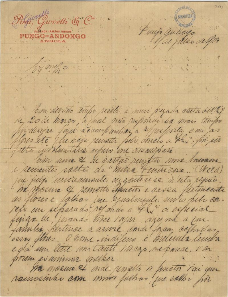 Em papel com timbre "C. Giovetti - Fazenda Irmãos Unidos - Pungo Andongo - Angola".