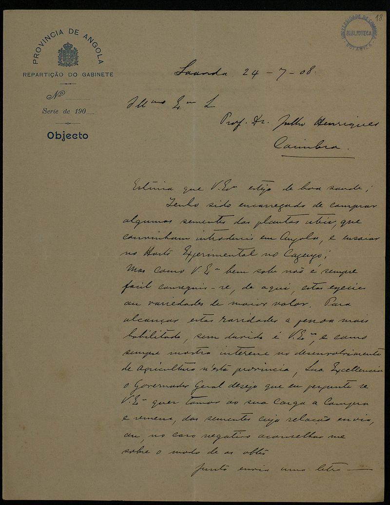 [Carta], 1908 Jul. 24, Loanda, [a] Prof. Dr. Júlio Henriques, Coimbra